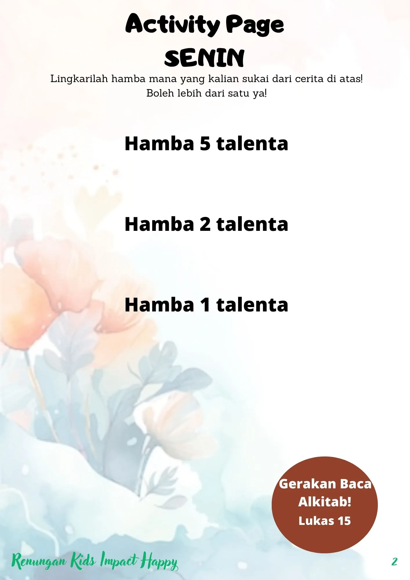 Dalam Alkitab ada perumpaan di mana ada seorang Tuan memberikan talenta kepada 3 orang hambanya. Ada yang mendapatkan lima talenta, dua talenta dan satu talenta. Ada yang mengembangkan talenta tersebut dan ada juga yang tidak mengembangkannya. Tahukah kalian bahwa Tuhan juga memberikan talenta kepada setiap kita. Ada yang memiliki talenta dalam bermusik, menyanyi, memasak dan yang lainnya. Tidak ada satupun orang yang tidak Tuhan berikan talenta. Bersyukur ya, Tuhan berikan talenta dalam kehidupan setiap kita.