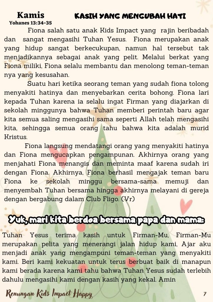 Tuhan Yesus terima kasih untuk Firman-Mu, Firman-Mu merupakan pelita yang menerangi jalan hidup kami, Ajar aku menjadi anak yang mengampuni teman-teman yang menyakiti kami. Beri kami kekuatan untuk terus berbuat baik di manapun kami berada karena kami tahu bahwa Tuhan Yesus sudah terlebih dahulu mengasihi kami dengan kasih yang kekal. Amin
