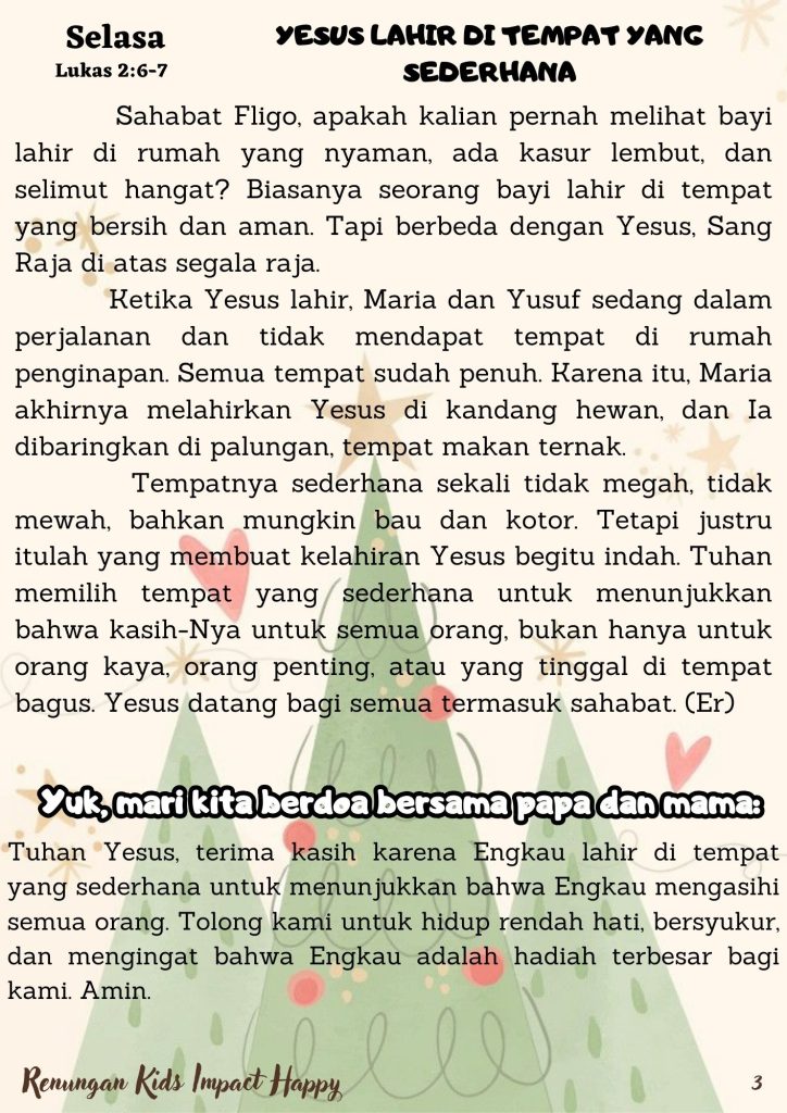 Tuhan Yesus, terima kasih karena Engkau lahir di tempat yang sederhana untuk menunjukkan bahwa Engkau mengasihi semua orang. Tolong kami untuk hidup rendah hati, bersyukur, dan mengingat bahwa Engkau adalah hadiah terbesar bagi kami. Amin.