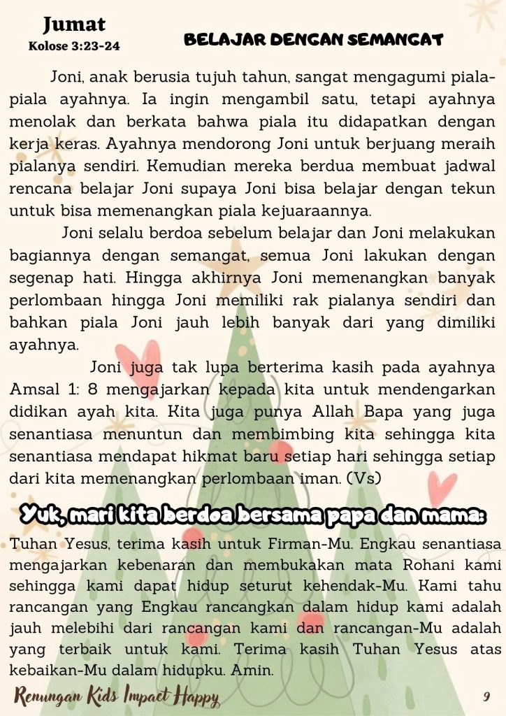 Setia itu seperti merawat tanaman kecil. Kalau kalian rajin menyiram tiap hari, perlahan-lahan tanaman itu tumbuh kuat. Begitu juga hati kita ketika kita setia, Tuhan membentuk kita menjadi anak yang dapat dipercaya.(Ar)