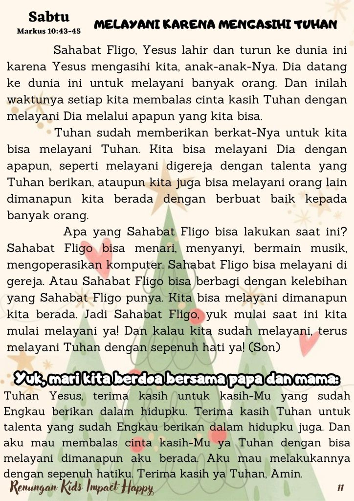 Sahabat Fligo, Yesus lahir dan turun ke dunia ini karena Yesus mengasihi kita, anak-anak-Nya. Dia datang ke dunia ini untuk melayani banyak orang. Dan inilah waktunya setiap kita membalas cinta kasih Tuhan dengan melayani Dia melalui apapun yang kita bisa.