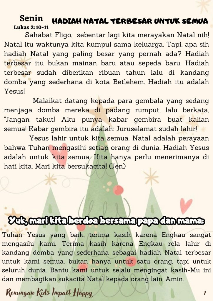 "Tuhan Yesus yang baik, terima kasih karena Engkau sangat mengasihi kami. Terima kasih karena Engkau rela lahir di kandang domba yang sederhana sebagai hadiah Natal terbesar untuk kami semua, bukan hanya untuk satu orang, tapi untuk seluruh dunia. Bantu kami untuk selalu mengingat kasih-Mu ini dan membagikan sukacita Natal kepada orang lain. Amin."