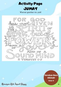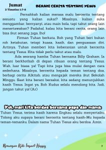 Firman Tuhan berkata, Roh yang Tuhan beri bukan roh ketakutan, tetapi kuasa, kasih, dan penguasaan diri. Artinya, Tuhan memberi kita keberanian untuk bercerita tentang Yesus. Kita tidak perlu takut atau malu.