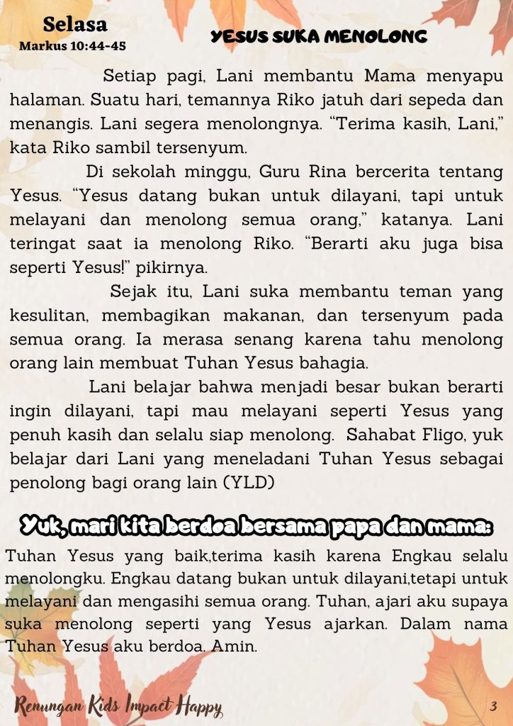 Lani belajar bahwa menjadi besar bukan berarti ingin dilayani, tapi mau melayani seperti Yesus yang penuh kasih dan selalu siap menolong. Sahabat Fligo, yuk belajar dari Lani yang meneladani Tuhan Yesus sebagai penolong bagi orang lain (YLD)