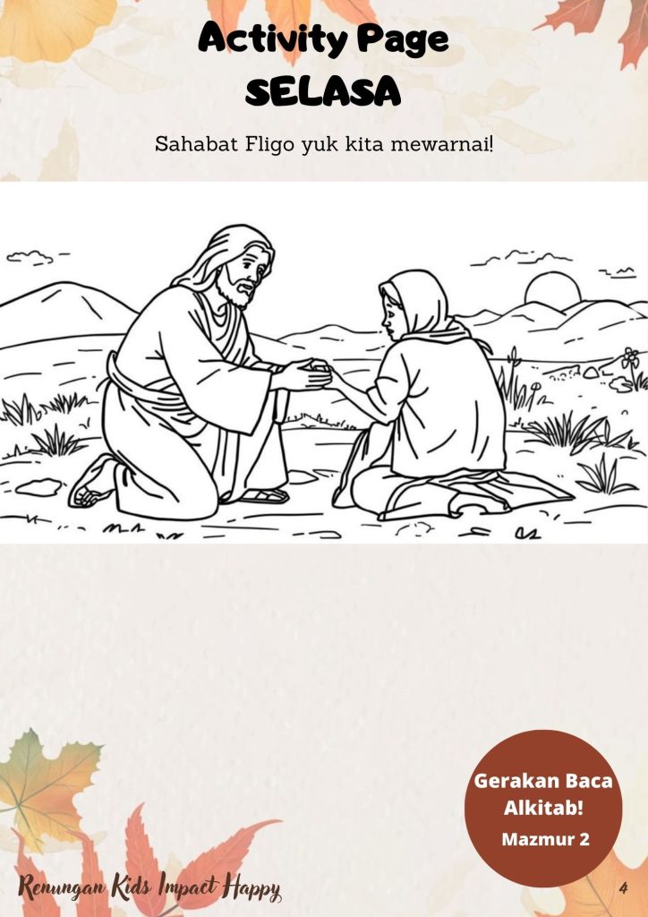 Di sekolah minggu, Guru Rina bercerita tentang Yesus. “Yesus datang bukan untuk dilayani, tapi untuk melayani dan menolong semua orang,” katanya. Lani teringat saat ia menolong Riko. “Berarti aku juga bisa seperti Yesus!” pikirnya.