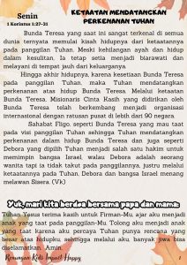 Sahabat Fligo, seperti Bunda Teresa yang mau taat pada visi panggilan Tuhan sehingga Tuhan mendatangkan perkenanan dalam hidup Bunda Teresa,dan juga seperti Debora yang dipilih Tuhan menjadi salah satu hakim untuk memimpin bangsa Israel, walau Debora adalah seorang wanita tapi ia tidak takut pada panggilannya, justru melalui ketaatannya pada Tuhan, Debora dan bangsa Israel menang melawan Sisera. (Vk)