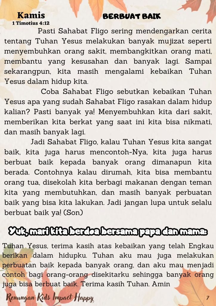 Jadi Sahabat Fligo, kalau Tuhan Yesus kita sangat baik, kita juga harus mencontoh-Nya, kita juga harus berbuat baik kepada banyak orang dimanapun kita berada. Contohnya kalau dirumah, kita bisa membantu orang tua, disekolah kita berbagi makanan dengan teman kita yang membutuhkan, dan masih banyak perbuatan baik yang bisa kita lakukan. Jadi jangan lupa untuk selalu berbuat baik ya! (Son)