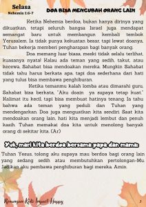 Doa memang luar biasa, meski tidak selalu terlihat, kuasanya nyata! Kalau ada teman yang sedih, takut, atau kecewa, Sahabat bisa mendoakan mereka. Mungkin Sahabat tidak tahu harus berkata apa, tapi doa sederhana dari hati yang tulus bisa membawa penghiburan.