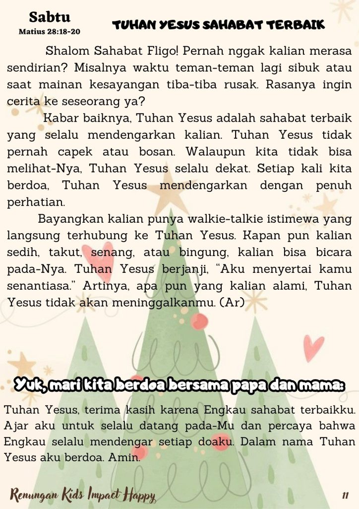 Kabar baiknya, Tuhan Yesus adalah sahabat terbaik yang selalu mendengarkan kalian. Tuhan Yesus tidak pernah capek atau bosan. Walaupun kita tidak bisa melihat-Nya, Tuhan Yesus selalu dekat. Setiap kali kita berdoa, Tuhan Yesus mendengarkan dengan penuh perhatian.