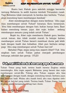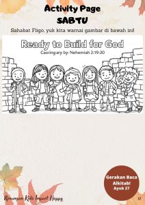 Sejak itu, Abet rajin membantu Kakak guru, berdoa untuk teman, dan tidak mudah marah. Ia belajar bahwa membangun untuk Tuhan berarti membuat dunia jadi lebih baik dengan kasih dan kebaikan. Abet pun berkata setiap pagi, “Aku siap membangun untuk Tuhan hari ini!”