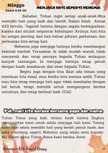 Tuhan Yesus yang baik, terima kasih karena Engkau mengajarkan kami untuk selalu menjaga hati kami. Tolong kami agar selalu memiliki hati yang bersih, penuh kasih, dan suka menolong, seperti Nehemia yang selalu setia kepada-Mu. Dalam nama Tuhan Yesus kami berdoa. Amin.