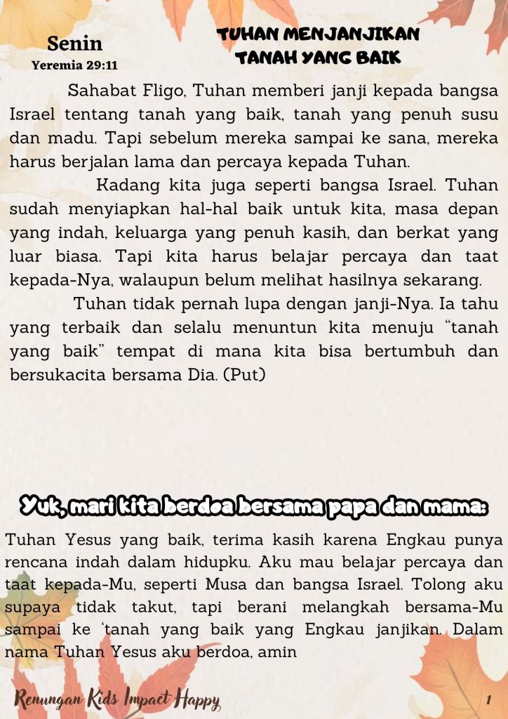 Sahabat Fligo, Tuhan memberi janji kepada bangsa Israel tentang tanah yang baik, tanah yang penuh susu dan madu. Tapi sebelum mereka sampai ke sana, mereka harus berjalan lama dan percaya kepada Tuhan.
