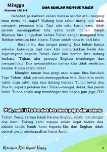 Karena itu, doa sangat penting. Doa bukan hanya sekadar kata-kata, tapi cara kita menunjukkan kasih dan kepercayaan kepada Tuhan. Saat kita berdoa, kita sedang berkata, “Tuhan, aku percaya Engkau mendengar dan mengasihiku.” Doa menunjukkan bahwa kita tidak sendirian, karena Tuhan selalu dekat.