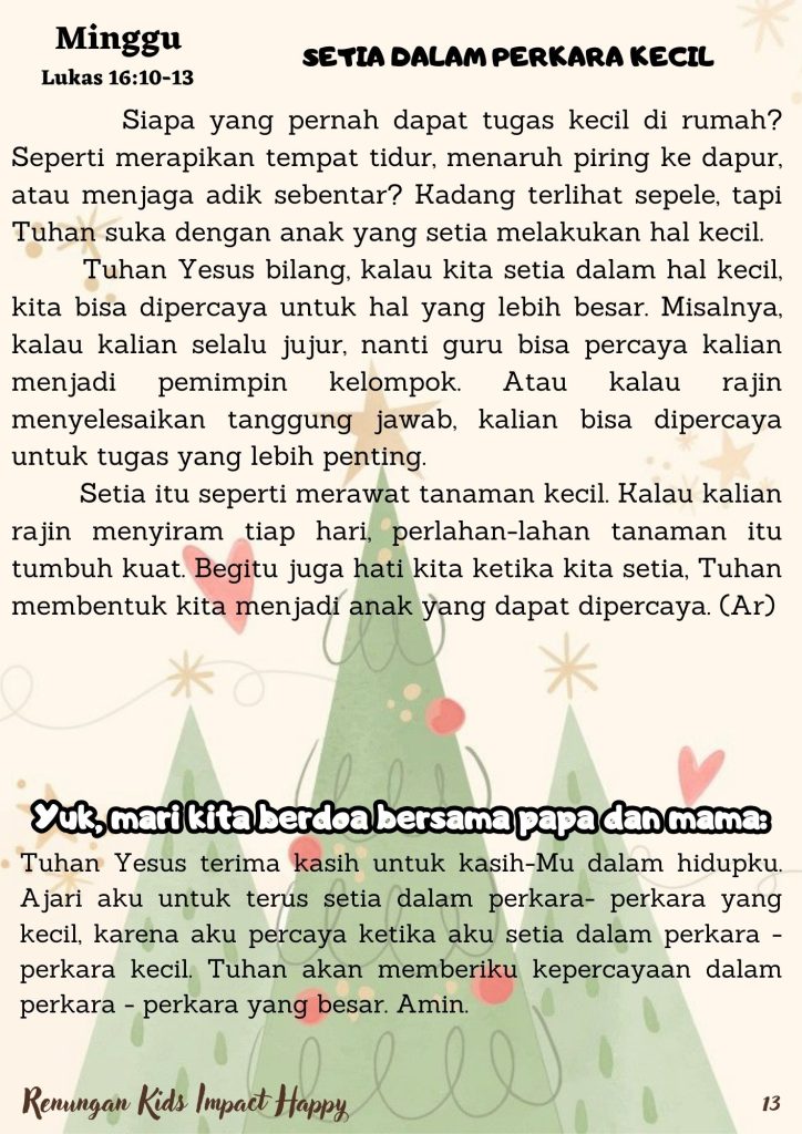 Siapa yang pernah dapat tugas kecil di rumah? Seperti merapikan tempat tidur, menaruh piring ke dapur, atau menjaga adik sebentar? Kadang terlihat sepele, tapi Tuhan suka dengan anak yang setia melakukan hal kecil.