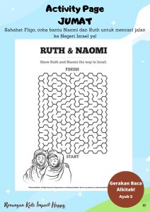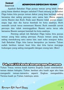 Apakah Sahabat Fligo punya teman yang lebih dekat yang biasa disebut dengan sahabat? Pasti senang ya Sahabat Fligo kalau kita punya teman dekat yang bisa berbagi, saling bersama dan saling percaya satu sama lain. Sama seperti cerita Naomi dan Ruth. Pada saat Naomi tidak punya siapa-siapa lagi, dan dia harus kembali ke kota asalnya, Ruth memilih untuk terus menemani Naomi. Ruth memilih untuk percaya dan tidak meninggalkan Naomi serta terus ada bersama Naomi sampai kembali ke kota asalnya.