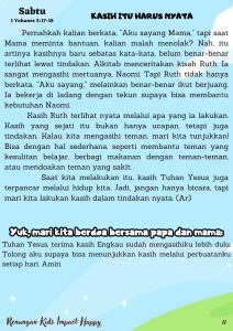 Pernahkah kalian berkata, “Aku sayang Mama,” tapi saat Mama meminta bantuan, kalian malah menolak? Nah, itu artinya kasihnya baru sebatas kata-kata, belum benar-benar terlihat lewat tindakan. Alkitab menceritakan kisah Ruth. Ia sangat mengasihi mertuanya, Naomi. Tapi Ruth tidak hanya berkata, “Aku sayang,” melainkan benar-benar ikut berjuang. Ia bekerja di ladang dengan tekun supaya bisa membantu kebutuhan Naomi.