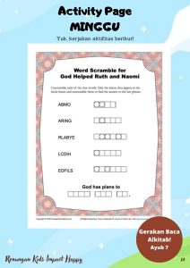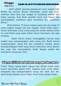Ruth berkata, “Di mana engkau pergi, aku pun pergi. Di mana engkau tinggal, aku pun tinggal.” Itulah kasih sejati—berani berkorban untuk orang yang kita kasihi, bahkan kalau itu sulit! Kasih yang sejati bukan hanya kata-kata, tapi juga tindakan.
