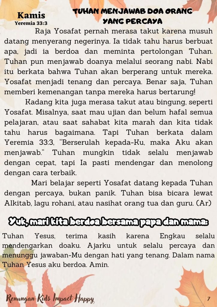 Mari belajar seperti Yosafat datang kepada Tuhan dengan percaya, bukan panik. Tuhan bisa bicara lewat Alkitab, lagu rohani, atau nasihat orang tua dan guru.(Ar)