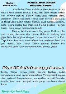 Tuhan Yesus, terima kasih karena Engkau sudah mengajarkan kami untuk memaafkan. Tolong kami supaya bisa berdamai dengan teman dan saudara, seperti Esau dan Yakub. Kami mau menjadi anak yang membawa damai. Amin.