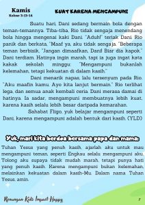Suatu hari, Dani sedang bermain bola dengan teman-temannya. Tiba-tiba, Rio tidak sengaja menendang bola hingga mengenai kaki Dani. “Aduh!” teriak Dani. Rio panik dan berkata, “Maaf ya, aku tidak sengaja. ”Beberapa teman berbisik, “Jangan dimaafkan, Dani! Biar dia kapok.” Dani terdiam. Hatinya ingin marah, tapi ia juga ingat kata kakak sekolah minggu: “Mengampuni bukanlah kelemahan, tetapi kekuatan di dalam kasih.”