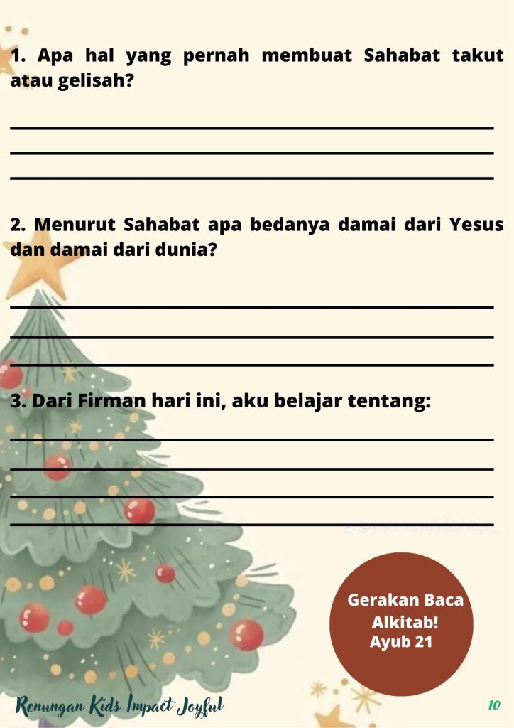 Tuhan Yesus yang baik, terima kasih karena Tuhan memberi damai sejati. Tolong aku untuk percaya bahwa Engkau selalu bersamaku. Berikan aku hati yang tenang, berani, dan penuh harapan. Dalam nama Tuhan Yesus, aku berdoa. Amin.”