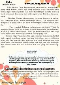 Tapi… apakah Nehemia melakukannya sendirian? Tidak! Ia mengajak semua orang untuk bekerja sama. Dan mereka semua berkata: “Kami siap untuk membangun!” Hebat ya! Karena semangat dan kerja sama, mereka bisa membangun kembali sesuatu yang baik.