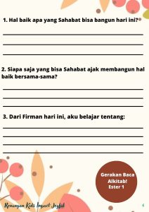 “Tuhan Yesus, tolong supaya kami semangat melakukan hal-hal yang baik, dan mau bekerja sama dengan papa mama, adik, kakak, dan teman-teman semua. Kami ingin menjadi anak-anak yang membangun, bukan merusak. Dalam nama Tuhan Yesus, Amin. ”