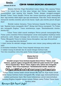 Sesudah sarapan yesus berkata kepada Simon Petrus: “ Simon, anak Yohanes, apakah engkau mengasihi Aku lebih dari pada mereka ini?” Jawab Petrus kepada-Nya: “: Benar Tuhan, Engkau tahu, bahwa aku mengasihi Engkau.” Kata Yesus kepadanya: “ Gembalakanlah domba- domba-Ku”