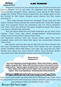 Nah sahabat, yukk kita ikuti apa yg telah Dion dan Petrus lakukan. Kita bisa mulai menceritakan kebaikan Tuhan Yesus kepada kita dan mengajak mereka beribadah dalam Kids Impact. Lalu siapa saja yang bisa kita ajak? Saudara kita, sepupu kita, teman dirumah bahkan teman disekolah. Mereka yang sudah lama tidak beribadah ataupun yang malas beribadah. (E)