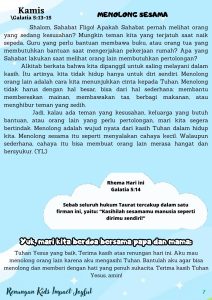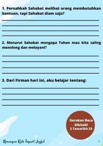 Alkitab berkata bahwa kita dipanggil untuk saling melayani dalam kasih. Itu artinya, kita tidak hidup hanya untuk diri sendiri. Menolong orang lain adalah cara kita menunjukkan cinta kepada Tuhan. Menolong tidak harus dengan hal besar, bisa dari hal sederhana: membantu membereskan mainan, membawakan tas, berbagi makanan, atau menghibur teman yang sedih.