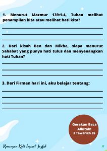 Sahabat, sering kali kita hanya melihat dari luar—baju yang bagus, sepatu keren, atau rambut yang rapi. Tapi Tuhan tidak seperti itu. Tuhan tidak melihat siapa yang paling keren, paling cantik, atau paling rapi. Yang Tuhan lihat adalah hati kita. Mazmur 139 berkata bahwa Tuhan sudah tahu isi hati kita bahkan sebelum kita berbicara. Artinya, Tuhan benar-benar mengenal siapa diri kita sebenarnya.