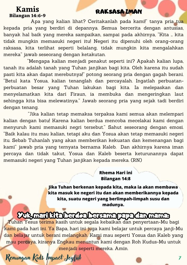 Tuhan Yesus terima kasih untuk segala kebaikan dan penyertaan-Mu bagi kami pada hari ini. Ya Bapa, hari ini juga kami belajar untuk percaya janji-Mu dan belajar untuk berani melangkah. Kami mau seperti Yosua dan Kaleb yang mau percaya, kiranya Engkau menuntun kami dengan Roh Kudus-Mu untuk menjadi seperti mereka. Amin.