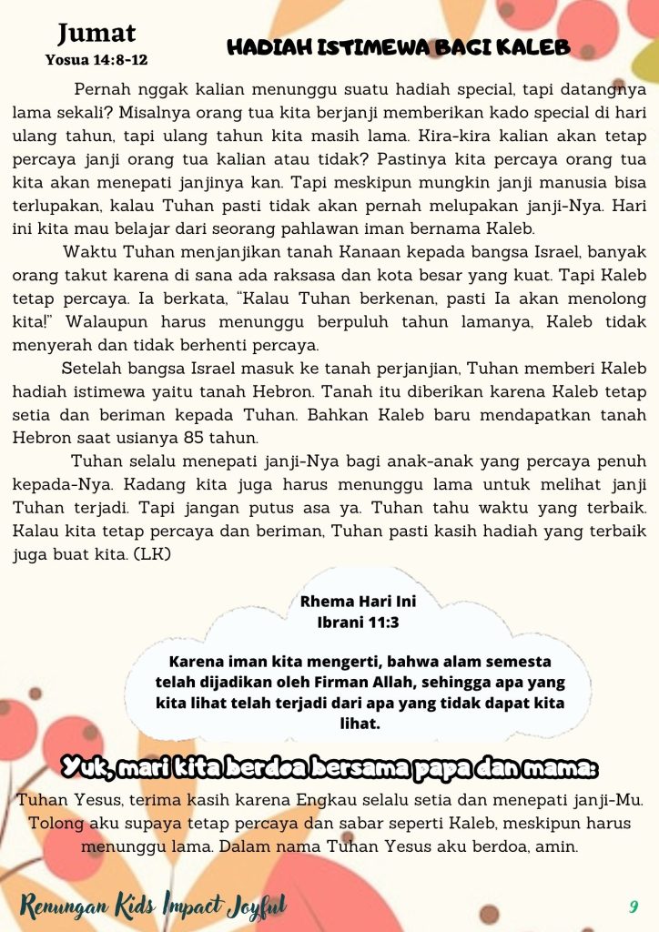 Pernah nggak kalian menunggu suatu hadiah special, tapi datangnya lama sekali? Misalnya orang tua kita berjanji memberikan kado special di hari ulang tahun, tapi ulang tahun kita masih lama. Kira-kira kalian akan tetap percaya janji orang tua kalian atau tidak? Pastinya kita percaya orang tua kita akan menepati janjinya kan. Tapi meskipun mungkin janji manusia bisa terlupakan, kalau Tuhan pasti tidak akan pernah melupakan janji-Nya. Hari ini kita mau belajar dari seorang pahlawan iman bernama Kaleb.