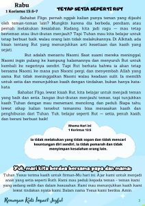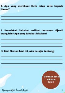 Tuhan Yesus terima kasih untuk firman-Mu hari ini. Ajar kami untuk menjadi anak yang setia seperti Ruth. Kami mau peduli kepada teman – teman kami yang sedang sedih dan dalam kesusahan. Kami mau menunjukkan kasih kami lewat tindakan nyata kami. Dalam nama Yesus kami berdoa. Amin.