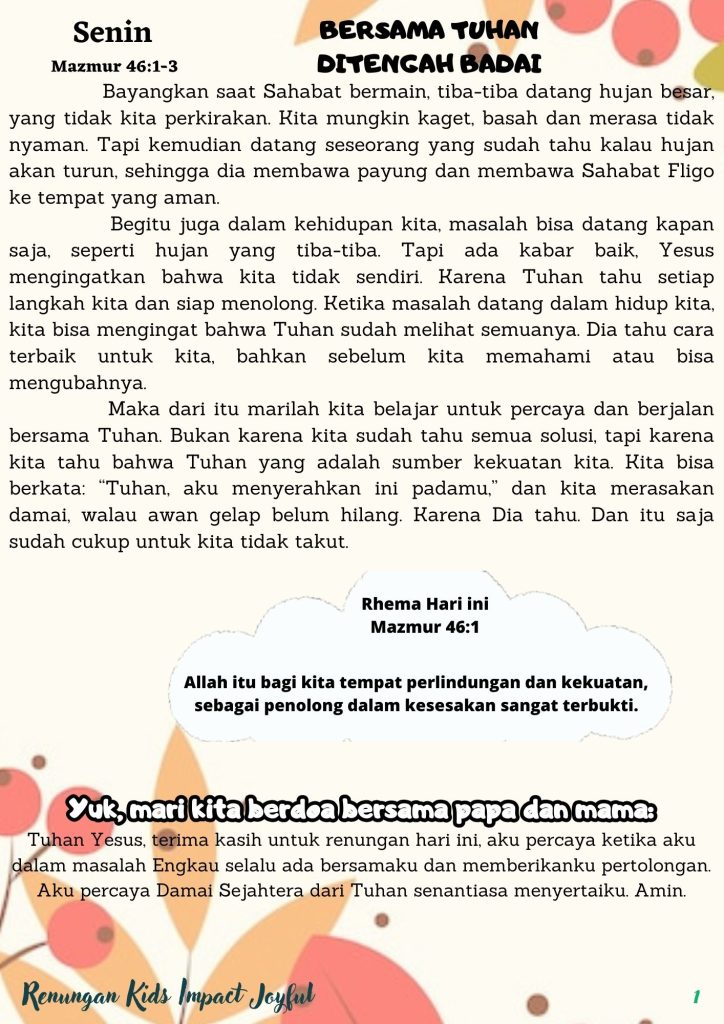 Maka dari itu marilah kita belajar untuk percaya dan berjalan bersama Tuhan. Bukan karena kita sudah tahu semua solusi, tapi karena kita tahu bahwa Tuhan yang adalah sumber kekuatan kita. Kita bisa berkata: “Tuhan, aku menyerahkan ini padamu,” dan kita merasakan damai, walau awan gelap belum hilang. Karena Dia tahu. Dan itu saja sudah cukup untuk kita tidak takut.