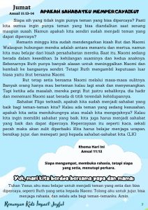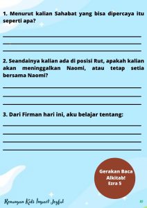 Tuhan Yesus, aku mau belajar untuk menjadi teman yang setia dan bisa dipercaya, seperti Ruth yang setia kepada Naomi. Tolong aku untuk jujur, bisa menjaga rahasia, dan selalu ada bagi teman-temanku. Amin.
