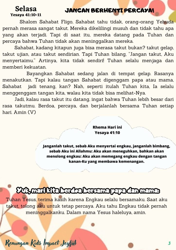 Sahabat, kadang kitapun juga bisa merasa takut bukan? takut gelap, takut ujian, atau takut sendirian. Tapi Tuhan bilang, “Jangan takut, Aku menyertaimu.” Artinya, kita tidak sendiri! Tuhan selalu menjaga dan memberi kekuatan.