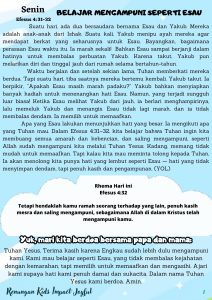 Apa yang Esau lakukan menunjukkan hati yang besar. Ia mengikuti apa yang Tuhan mau. Dalam Efesus 4:31–32, kita belajar bahwa Tuhan ingin kita membuang semua amarah dan kebencian, dan saling mengampuni, seperti Allah sudah mengampuni kita melalui Tuhan Yesus. Kadang, memang tidak mudah untuk memaafkan. Tapi kalau kita mau meminta tolong kepada Tuhan, Ia akan menolong kita punya hati yang lembut seperti Esau — hati yang tidak menyimpan dendam, tapi penuh kasih dan pengampunan. (YOL)